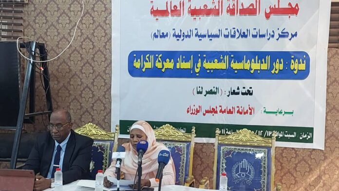 ودعت سلوى خلال مخاطبتها ” “دور الدبلوماسية الشعبية في إسناد معركة الكرامة ” تحت شعار ” النصر لنا ” .. التي اقامها مجلس الصداقة الشعبية العالمية بالتعاون مع مركز دراسات العلاقات السياسية الدولية معالم- اليوم السبت بقاعة دار الشرطة بورتسودان- دعت إلى ضرورة إطلاق منصة تواصل شعبية (رقمية او إعلامية ) تتولى نشر الرسائل والأخبار والتحليلات المتعلقة بمعركة الكرامة، بجانب توحيد الخطاب الوطني بالداخل والخارج.